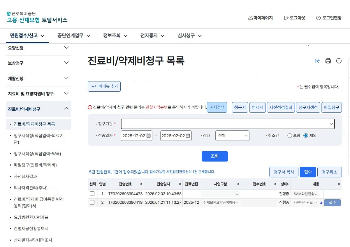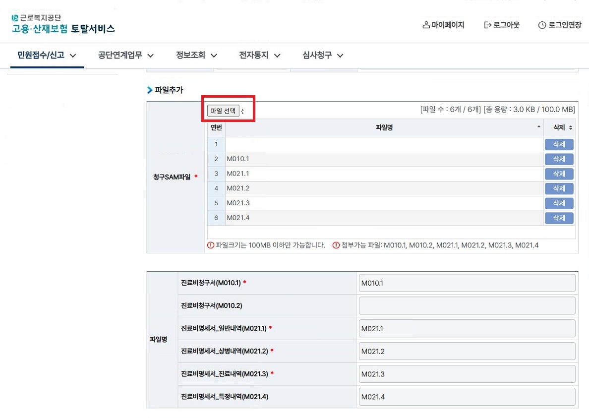 민원접수/ 신고 -> 진료비 약재비 청구 -> 파일청구(진료비/약재비) 선택
