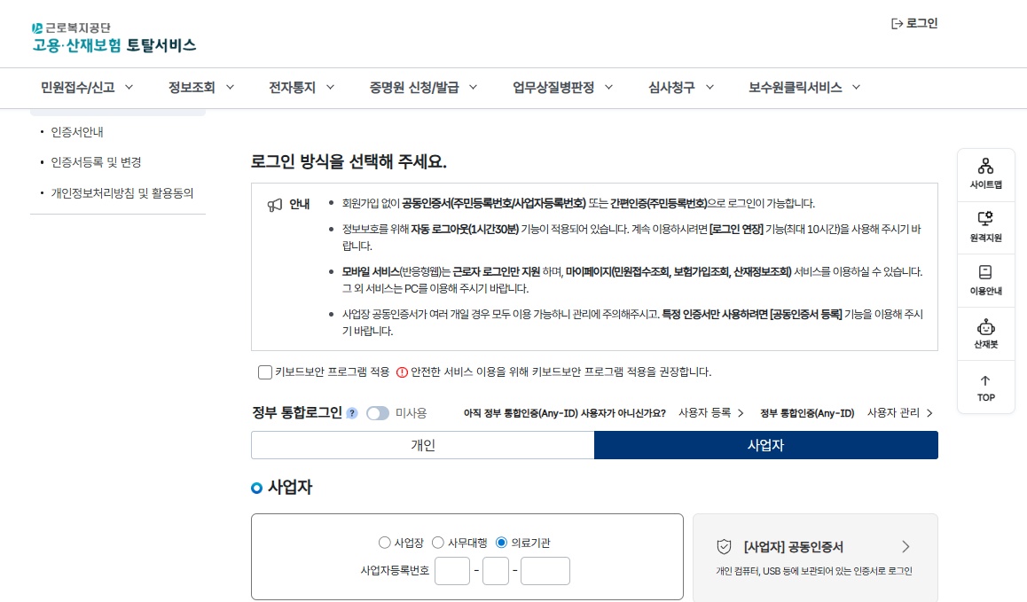 의료기관 [ 사업자 등록번호 입력 ] -> 인증서 로그인