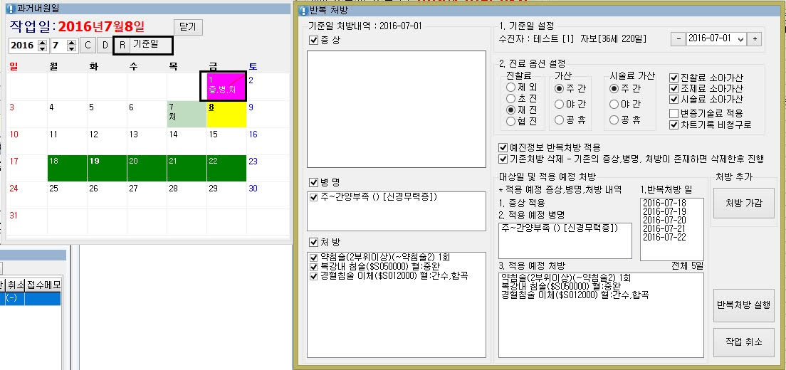 기준일을 선택하면 반복처방 창이 나오게되며 진료옵션설정을 확인한후