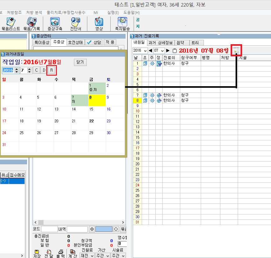진료실창에서 과거진료기록 상단 달력 아이콘을 선택하면