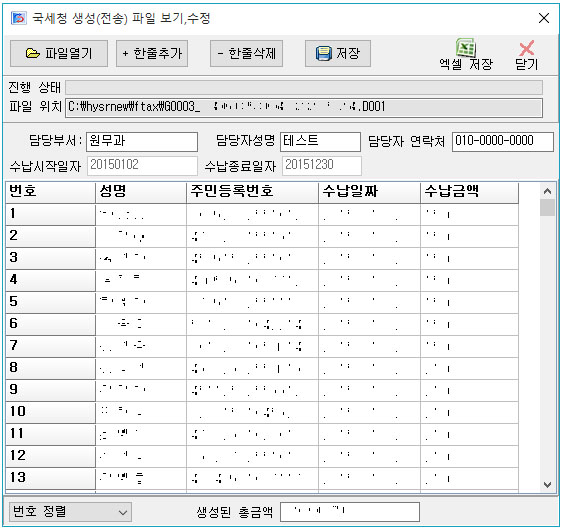 생성된 파일을 보거나 수정할 경우 [국세청 생성파일 보기,수정] 에서 작업합니다.