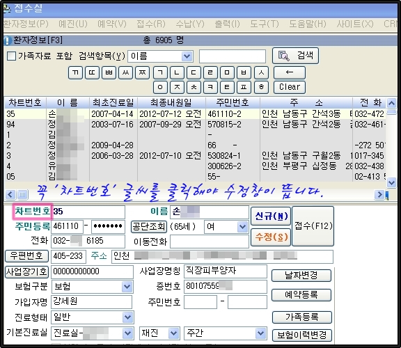 환자가 신규 내원 시 보험증을 안갖고 오는 경우 환자이름을 잘못 등록할 경우가 있습니다.