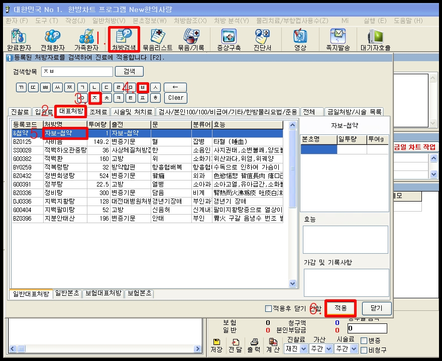 처방검색시 검색항목에 자보라고 입력해도 가능하지만 초성검색기능을 활용하여 자보의  'ㅈ', 'ㅂ'을 마우스로 클릭해봤습니다.