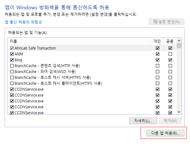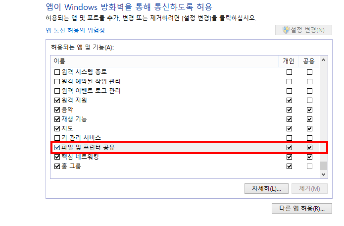 -> windows 방화벽을 통해 앱또는 기능 허용 선택