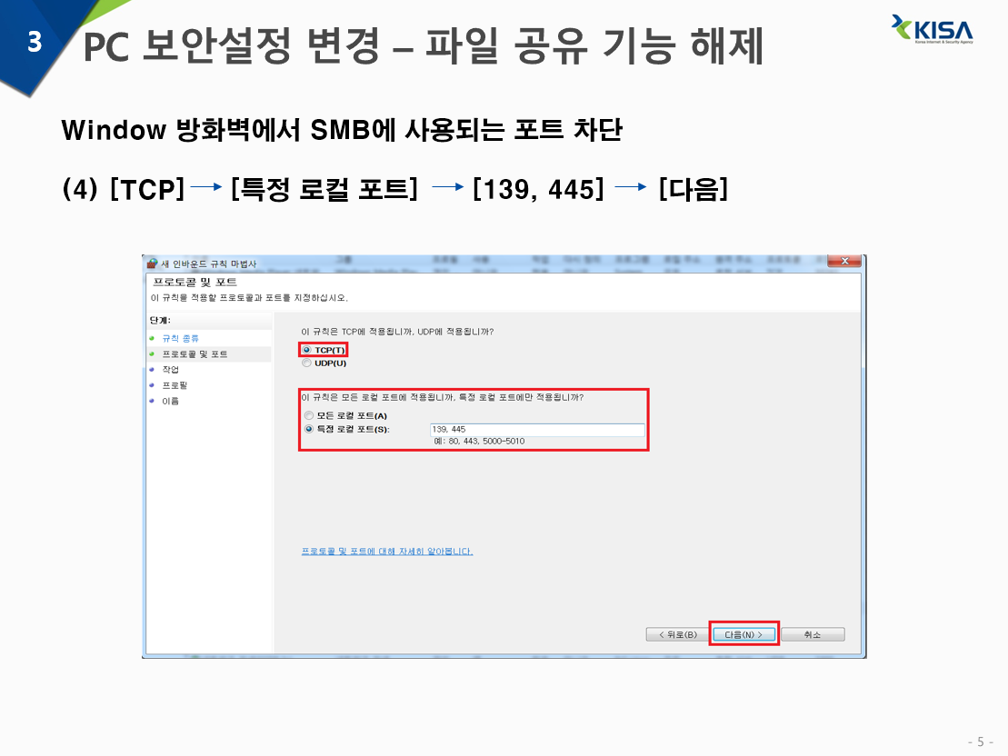 4) TCP -> 특정 로컬 포트 -> 139,445 -> 다음