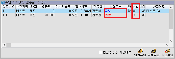 접수실 수납대기 보험구분 색상표시