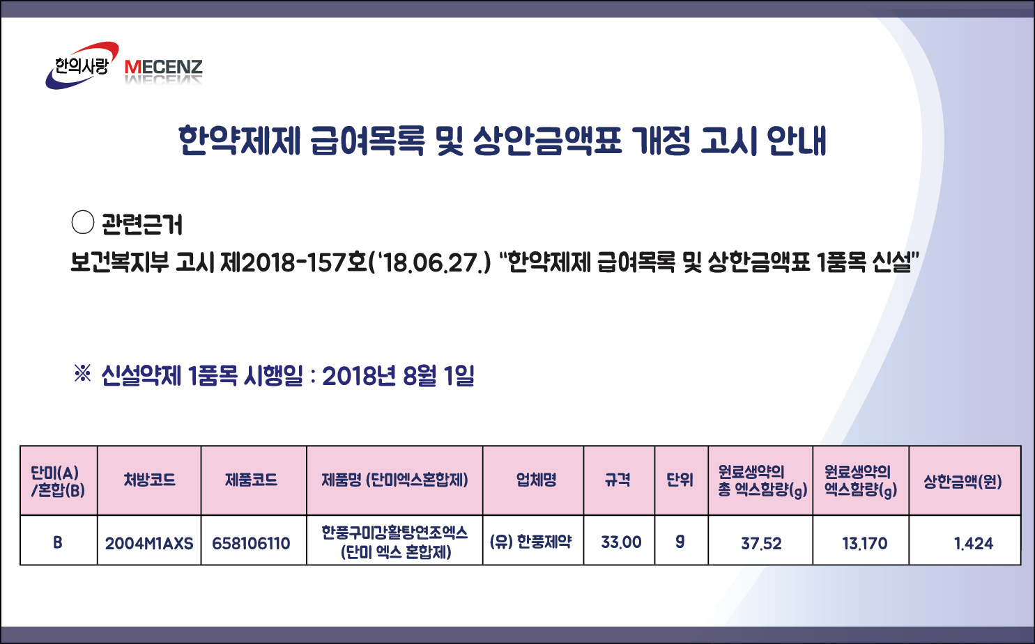 2018년 8월 1일 한약제제급여목록 및 상안금액표 개정고시