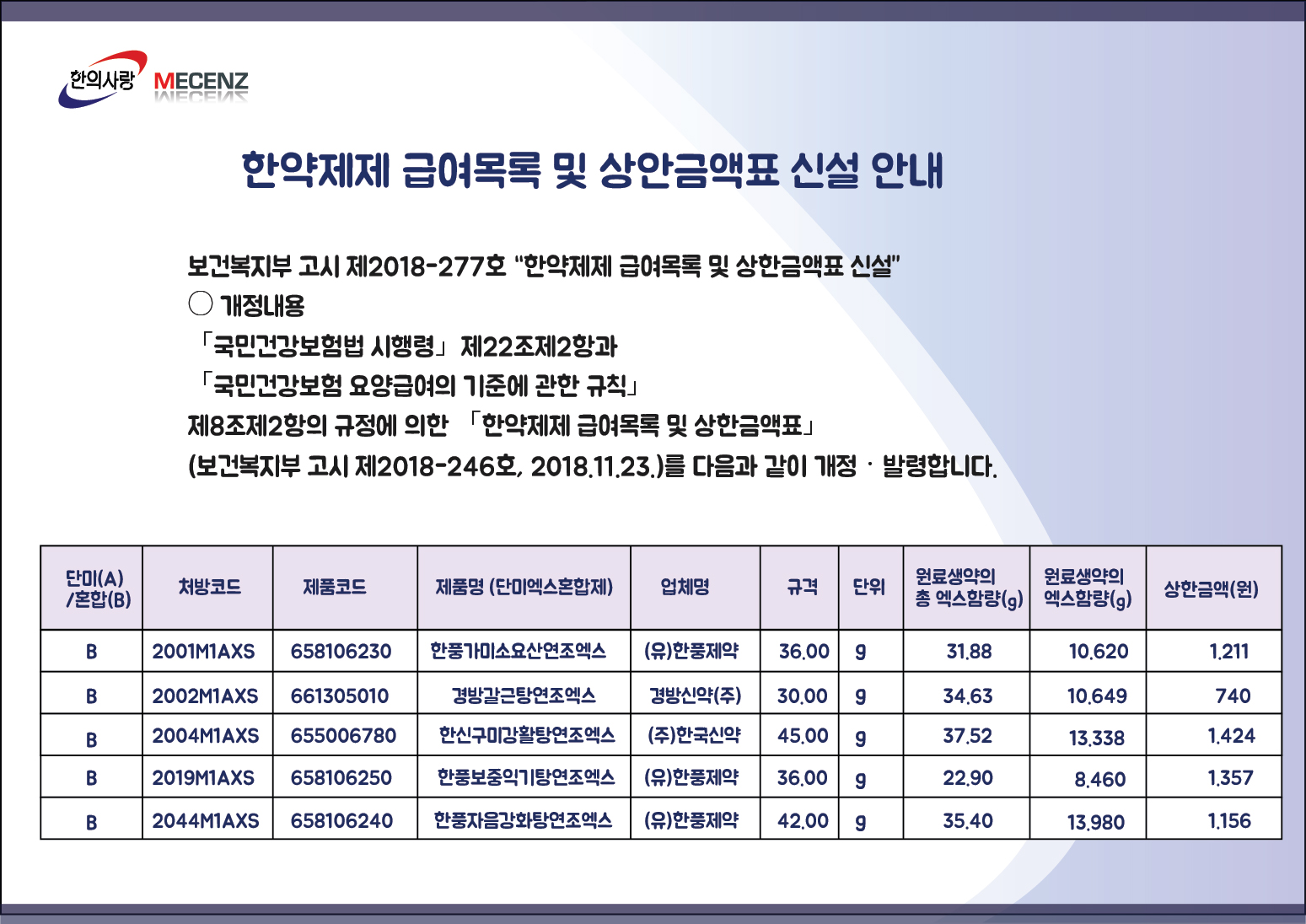 [팝업] 2018년 12월 21일 한약제제급여목록 및 상안금액표 개정고시