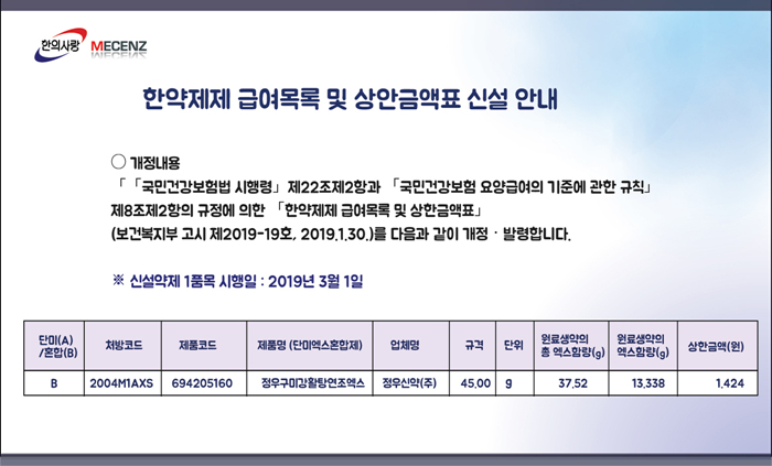 [팝업] 2019년 2월 21일 한약제제급여목록 및 상안금액표 개정고시