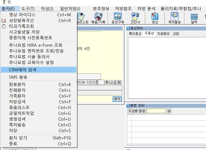 진료실 상단 메뉴 환자 -> CRM 예약 검색 을 통해 예약환자 리스트를 진료실에서 확인할 수 있습니다.