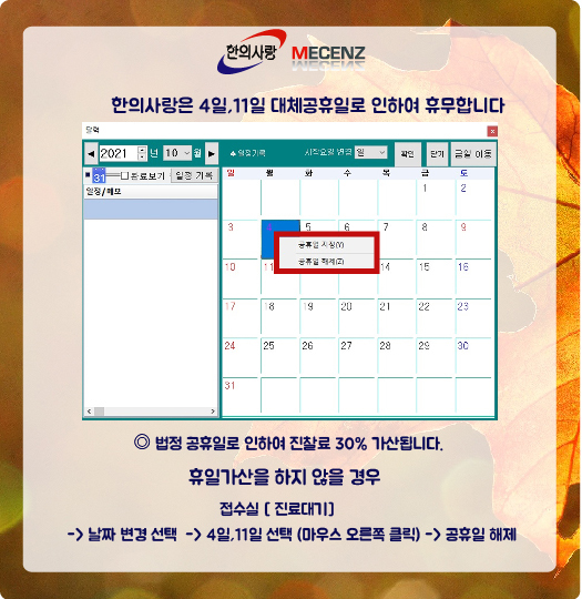 [팝업] 10월 4일,11일 임시공휴일 안내 및 공유가산 설정 안내