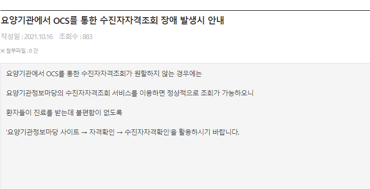 공단 서버 장애 (건강보험공단 신요양기관 정보마당 공지사항)