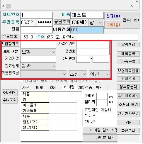 3. 한의사랑 접수실 환자정보 입력창에 정보입력