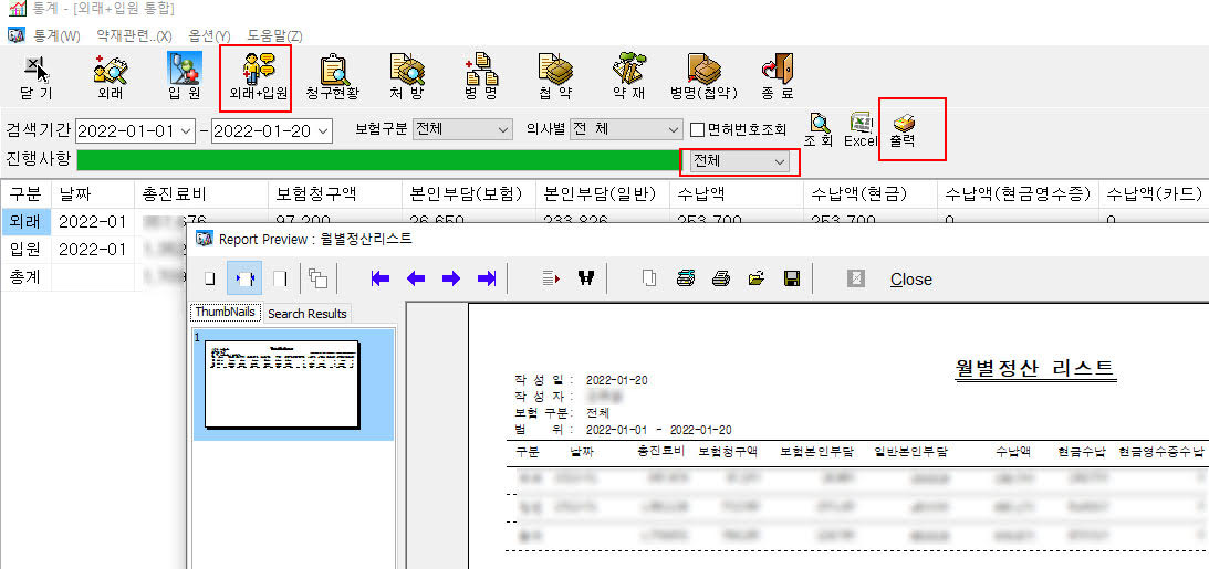입원용 통계 (외래+입원) 월별정산 인쇄 출력 추가 업그레이드