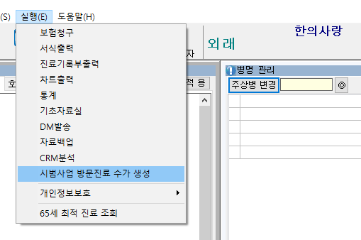 방문진료 수가 생성은 진료실 실행->시범사업 방문진료 수가 생성에서 정할 수 있습니다.