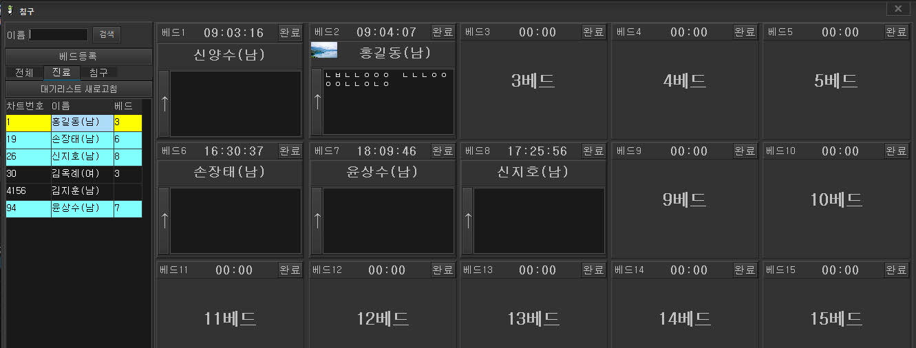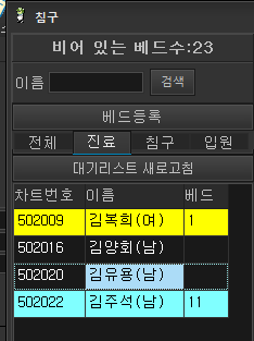 침구 완료된 환자는 노란색, 치료중인 분은 하늘색으로 표시 됩니다.