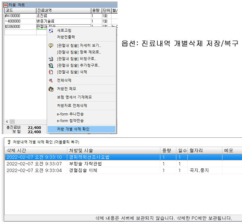 진료내역 개별삭제 저장, 복구 기능 추가 업그레이드