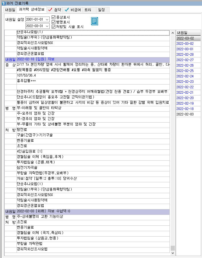 과거력보기 외래,입원 내월일 색 구분 추가 되었습니다.