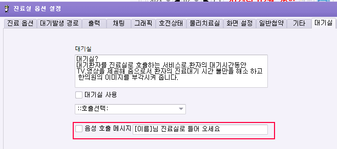음성메시지 수정 ->  진료실 환경설정 대기실 -> 음성 호출 메시지 체크