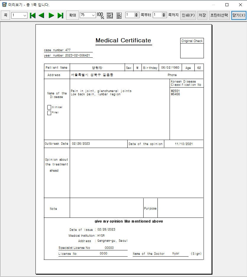 영문진단서 출력 옵션 체크시