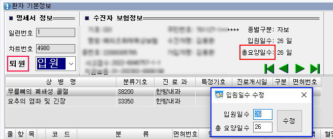 총 요양일수를 클릭하면 입원일수, 총 요양일수를 수정할 수 있습니다.