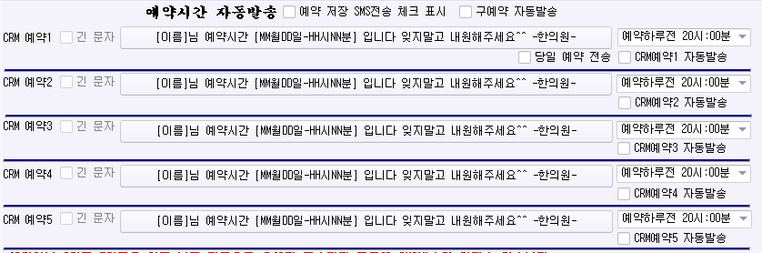 접수실 예약 SMS 자동발송 예약1 ~ 예약5 자동발송 할 수 있게 옵션 추가 되었습니다.