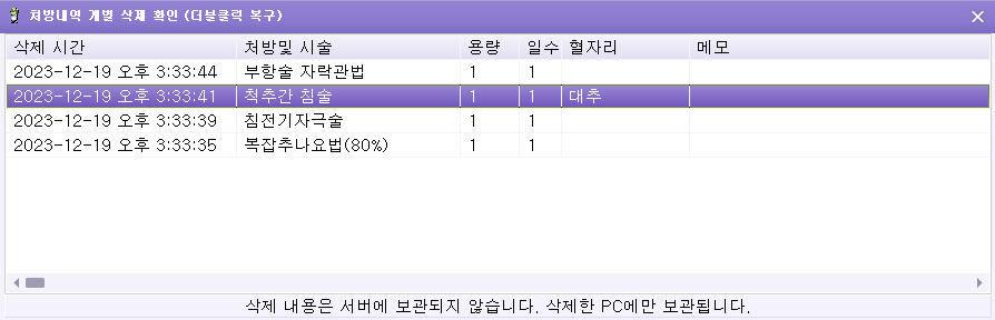 '진료내역 개별삭제 저장/복구' 옵션이 적용되면 실수로 개별 삭제된 경우 복구할 수 있습니다.