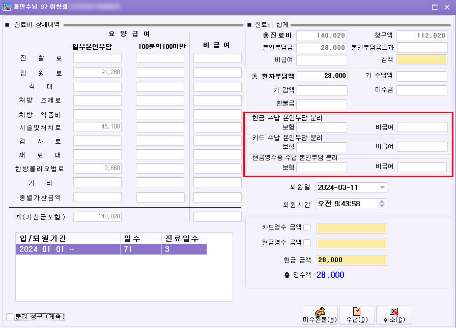 퇴원수납 현금,카드,현금영수증 수납 본인부담 분리가 추가 되어