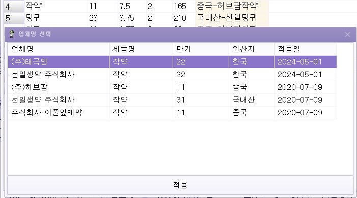 시범첩약 업체명 선택 적용일 추가 되었습니다.