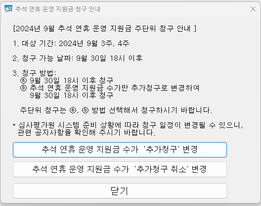 추석 연휴 운영 지원금 청구 안내 업데이트