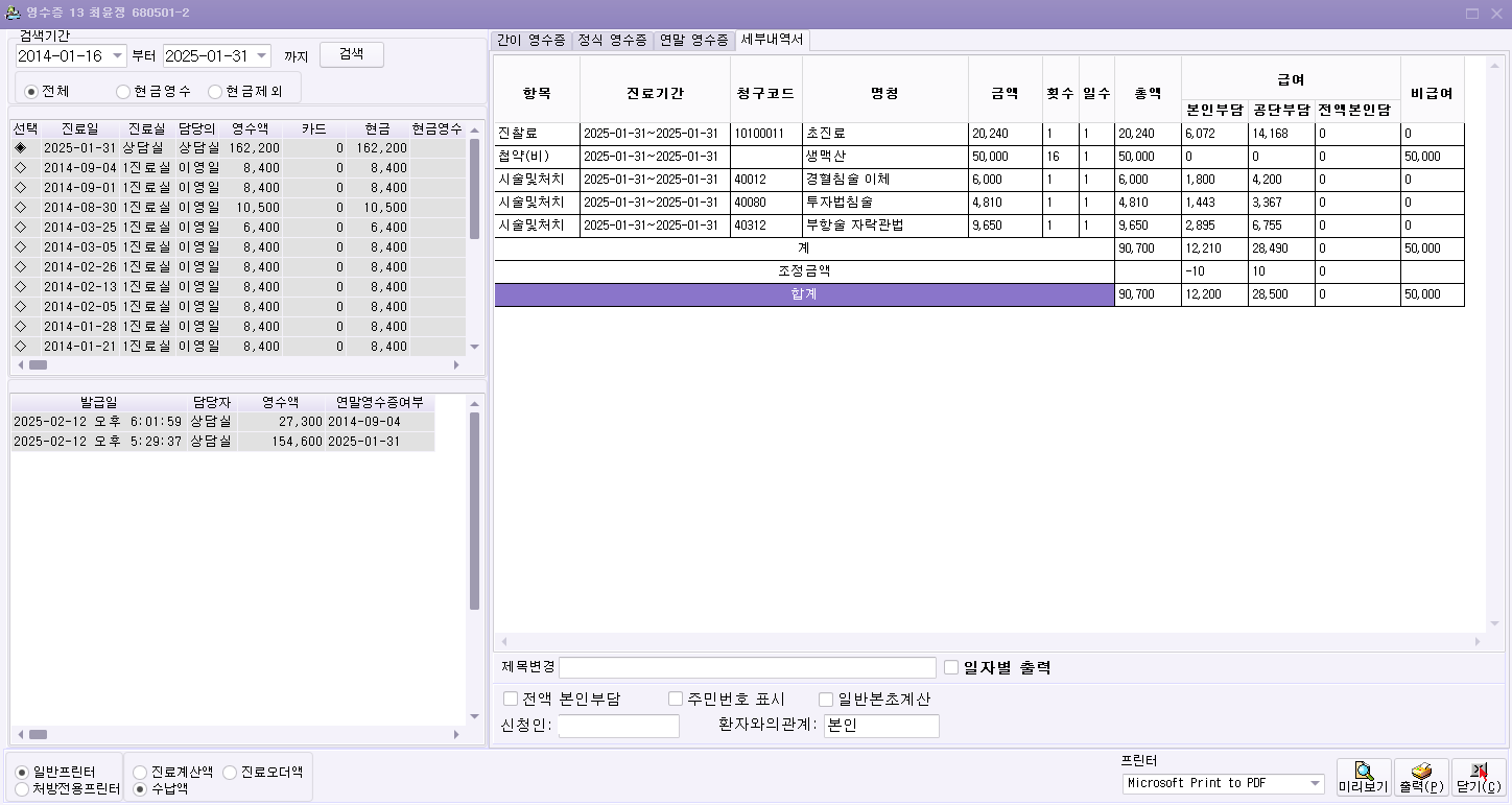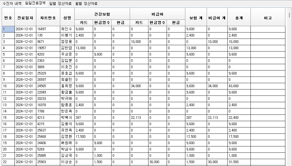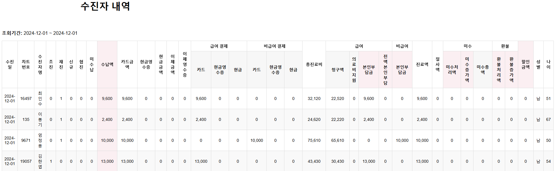 총진료비, 수납액, 미수 환불, 결제 구분, 산정액을 쉽게 확인할 수 있도록 개선했습니다.