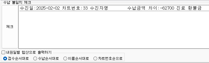 혹시나 계산이 안맞는다고 문의오면 수진자내역 CTRL+E키 누르면 '수납 불일치 체크'