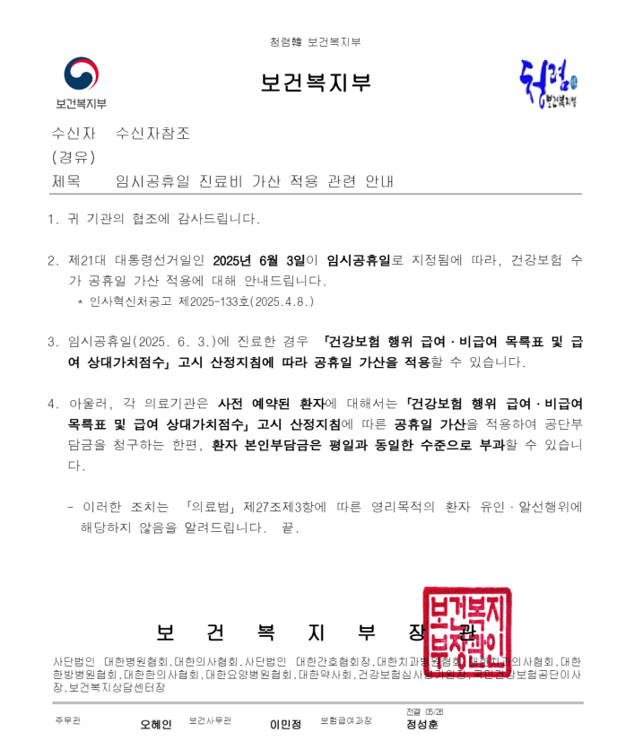 6월 3일 임시공휴일 진료비 가산 안내