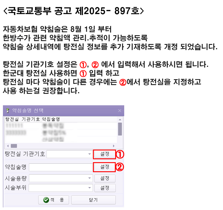 진료실 8월 1일 자보 약침술은 탕전실 기관기호 기재 하도록