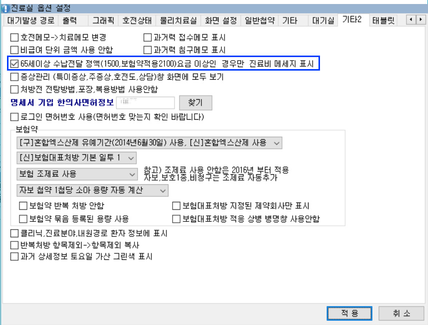 2. 입원외래 메세지출력 업그레이드 - 65세이상 환자에게 적용되는 금액 관련 메세지가 추가 되었습니다.