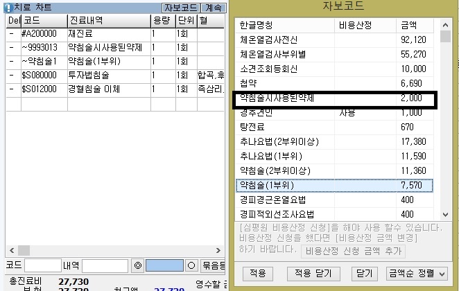 약침술 적용시  [약침술사용된약제가] 자동 적용됩니다.