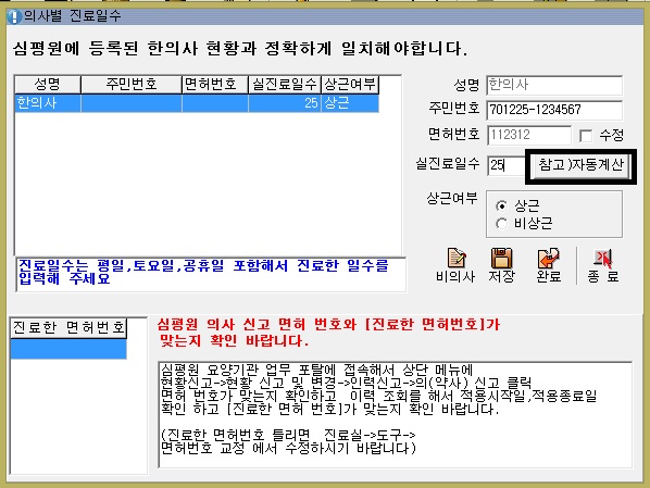 의사별 진료일수가  토요일 공휴일 자동계산되며 등록됩니다.