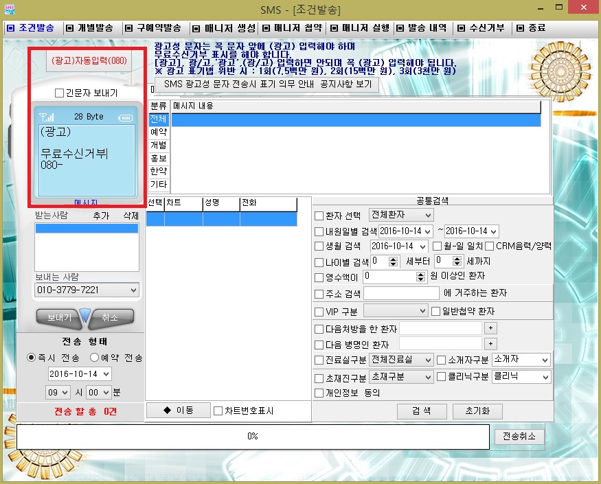 SMS개별전송 검색결과에서 차트번호가 추가되었습니다.